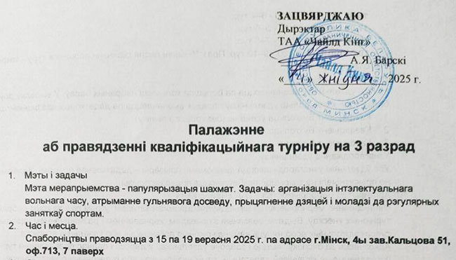 Норма 3 разраду складае 75% (7,5 балаў з 10 магчымых). Запіс партый абавязковы, кожны ўдзельнік павінен мець асадку і нататнік для запісу.
