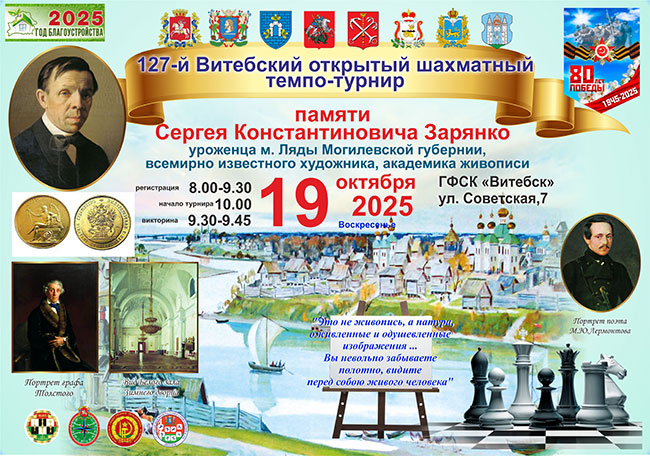 Темпо-турнир проводится 19.10.2025 г. (воскресение) в 10.00 по адресу: г. Витебск ул. Советская 7, шахматный клуб ГФСК «Витебск» (регистрация с 8.00 до 9.30).