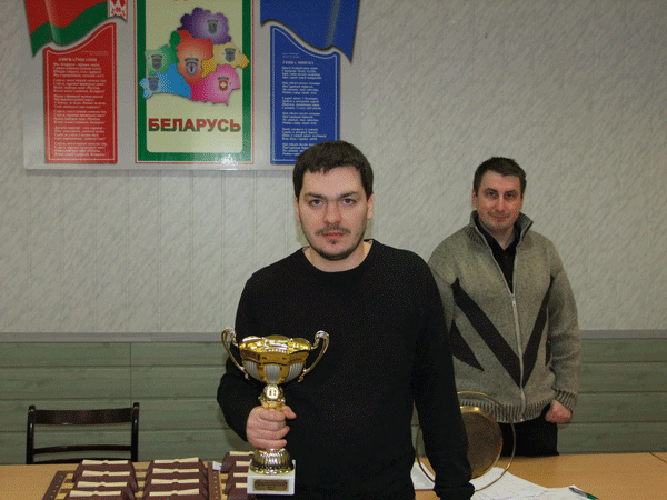 Первый победитель возрожденного Кубка Беларуси по быстрым шахматам — Денис Трифонов — и главный судья турнира А. Малюш.