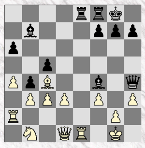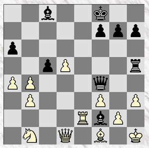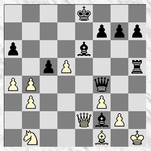 Qxh3+!? 27.gxh3 Bxf3+ 28.Kh2 Bf4+ 29.Kg1 Rxe2 30.Kf1 Rf2+ 31.Kxf2 Bxd1 32.cxb4 cxb4 с лишней пешкой и двумя слонами в эндшпиле] 27.Re1 Re5 28.d4 Rh5 29.d5 Kf8 30.cxb4 Bc8! 31.Bf1? решающая ошибка [необходимо было 31.Rxe3 ] 31