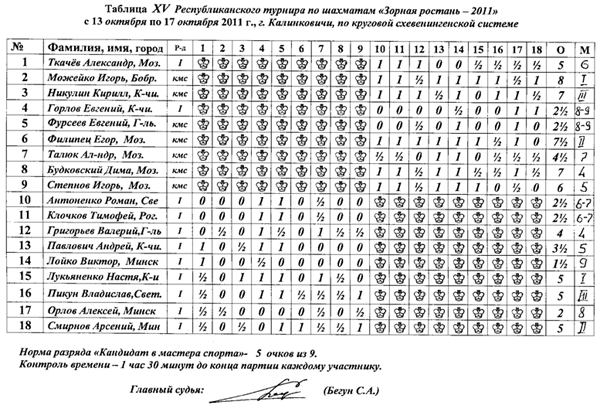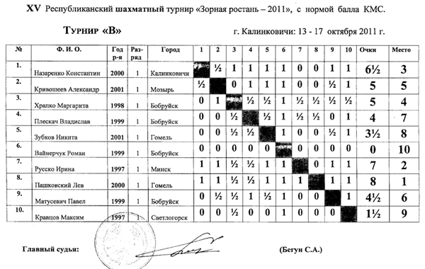 10 перворазрядников играли по круговой системе. Уверенную победу одержал Пашковский Лев (г. Гомель) набрав 8 очков из 9.