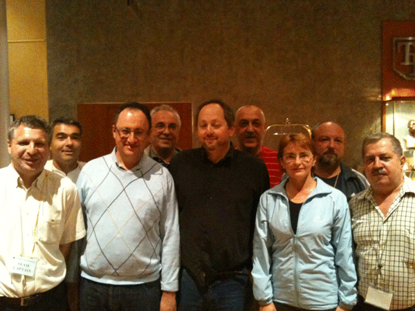Попробовали собрать всех "белорусов" вместе. Слева направо: мм В.Атлас (Австрия), мг Д.Сагальчик (США), мг Б.Гельфанд (Израиль), кмс С.Магонов (США), мг И.Смирин (Израиль), кмс В.Обламский (Беларусь), мг Е.Заяц (Россия-Беларусь), капитан "Веснянки" В.Гинзбург (беларусь), мм Е.Мочалов (Беларусь).
