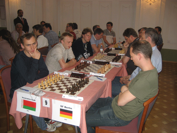 В четвертом туре “Веснянка-Гран” одержала трудовую победу над клубом “SF Berlin” со счетом 4: 2 и вновь вернулась в группу лидеров. Кто следующий?! Бронзовый призер предыдущего розыгрыша — черниговский клуб (Украина) с умопомрачительным названием “A DAN DZO & PGMB”! Чтобы представить силу соперника отмечу, что“лишь” на 4-й доске за них играл наш Сергей Азаров. Исключительно напряженный матч, к нашему огорчению, закончился поражением с минимальным счетом 2,5: 3,5.
