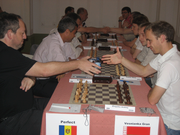 На старте турнира нашим соперником стала команда “Perfect”, выступавшая под молдавским флагом во главе с Ильей Смириным! Сюрпризом было и наличие в составе “молдаван” еще двух наших бывших соотечественников — Геннадия Сагальчика и Геннадия Славина. В упорной борьбе нам удалось одержать крупную победу 5,5:0,5.