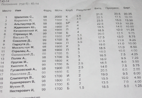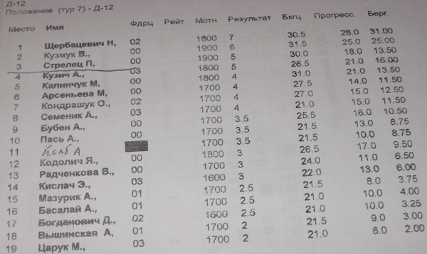 К сожалению, фаворит — Вероника Кузмук не показала всего на что способна, девочка увлекается "троеборьем" шахматы + теннис + плавание, причем во всех видах спорта минимум победительница области (!). Наверное, когда то придется остановить свой выбор на чем-то конкретном