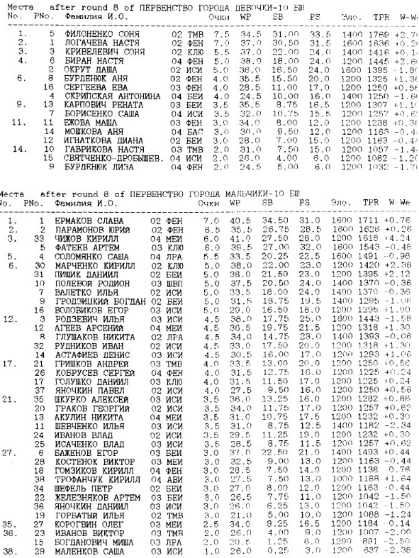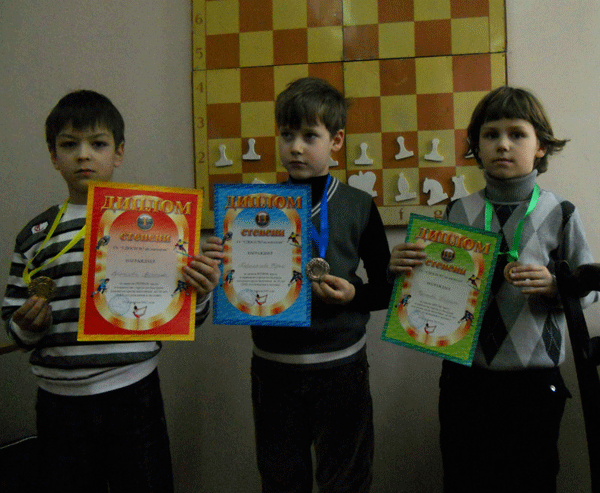 Первенство области до 8 лет. Среди мальчиков победителем стал Царук Максим из Светлогорскас 6,5 очками, второе место занял Агеев Арсений из Гомеля с 5,5 очками и третье место в упорной борьбе по коэффициенту Бухгольца с 5 очками досталось Космачёву Павлу из Калинкович.