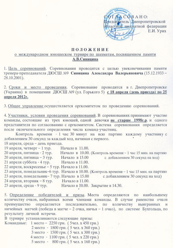 С 18 апреля (день приезда) по 25 апреля в г.Днепропетровск / Украина / состоится международный юношеский турнир памяти А. В. Синицина. Днепропетровская областная шахматная федерация хотела бы пригласить на эти соревнования команду из любого города Беларуси.