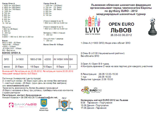 В преддверии чемпионата Европы по футболу Львовская шахматная федерация с 28.05-2.06 2012 организовывает шахматный фестиваль,в программу которого включены 2 опен турнира с призовым фондом около 2000 Евро. Приглашаем в древний Львов,ощутить праздничную атмосферу EURO-2012,поиграть в шахматы и почувствовать средневековый дух города.