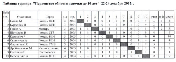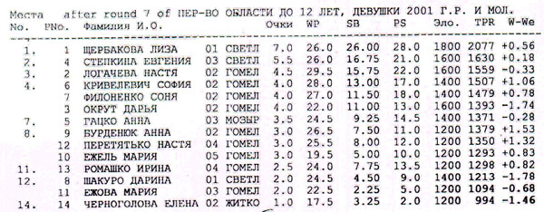 У девочек до 12 лет не оставила шансов на победу Щербакова Елизавета из Светлогорска набравшая 7 очков, второе место с 5,5 очками у Степкиной Евгении из Светлогорска, третье место с 4,5 очками у Логачевой Анастасии из Гомеля.