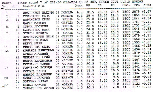 У мальчиков до 12 лет победителем с 6,5 очками, потеряв лишь 0,5 очка стал Иванников Максим из Гомеля, второе место с 5,5 очками у Кривошеева Александра из Мозыря и третье определилось по коэффициенту Бухгольца с 5 очками у Парамонова Юрия из Гомеля.