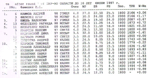 У юношей до 16 лет неожиданно, но заслуженно победителем стал Климов Андрей из Гомеля с 6 очками, второе по коэффициенту Бухгольца с 6 очками занял Филипец Егор из Мозыря. Третье с 5,5 очками занял Ежель Валентин из Гомеля.