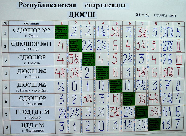 26 ноября в Пинске завершилась очередная Спартакиада детско-юношеских школ. 8 лучших школ из всех областей и г.Минска (1998 г.р и моложе., 4 юноши+2 девушки) приняли участие в соревнованиях.Итоговая командная таблица: