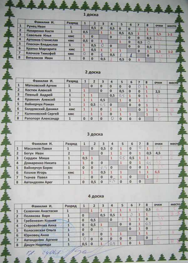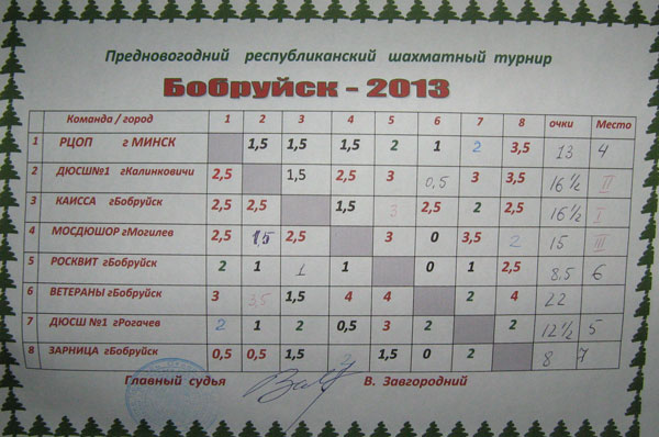 С 26 по 29 декабря в Бобруйске проходил предновогодний республиканский шахматный командный турнир. 8 команд из Минска, Могилева, Бобруйска, Рогачева, Калинковичи в составе 3 юноши +1 девушка 99 г. и моложе соревновались в духе лучших командных традиций.