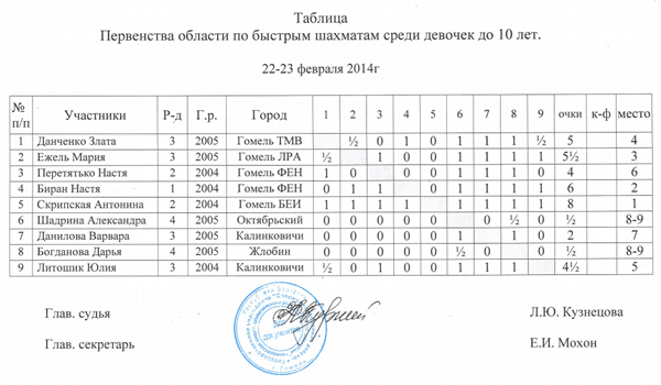 У девочек до 10 лет призерами стали представительницы Гомеля. Первое место со 100% результатом стала Скрипская Антонина, второе место у Биран Насти (6 очков) и третье с 5,5 очками — у Ежель Марии.