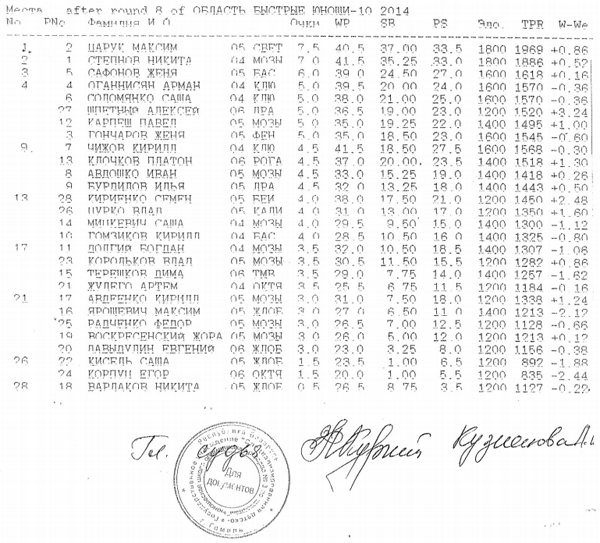 Призовые места по быстрым шахматам у мальчиков до 10 лет распределились следующим образом: Царук Максим из Светлогорска набрав 7,5 очков из 8 занял первое место. Степнов Никита из Мозыря с 7 очками занял 2 место и Сафонов Женя из Гомеля с 6,0 очками занял 3 место.