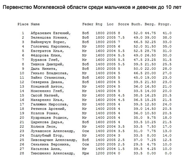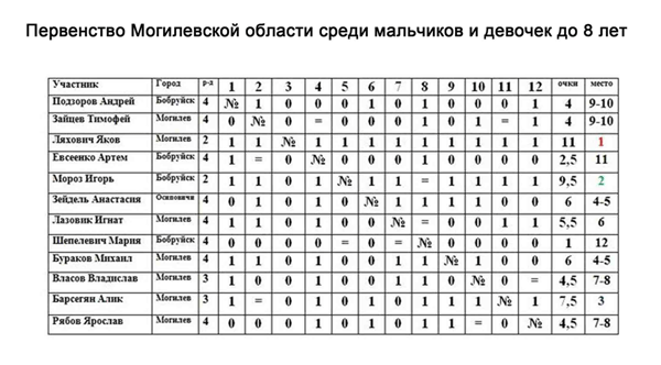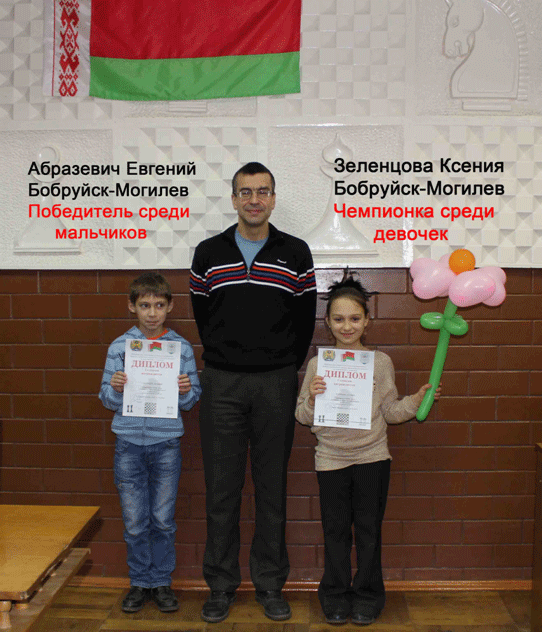 Соревнования десятилеток собрали 28 юных спортсменов из Бобруйска, Могилева, Осиповичей и Кричева. В девятитуровом общем турнире по швейцарской системе не было равным спортсменам из Бобруйска: Абразевичу Евгению, Зеленцовой Ксении и Вайнерчуку Борису, которые заняли весь пьедестал. Нужно отметить, что победитель турнира среди мальчиков Абразевич Евгений и победительница турнира среди девочек Зеленцова Ксения являются учениками Могилевской областной СДЮСШР по шахматам и занимаются у тренера Саксонова Л. Г. Поздравления и благодарность тренеру Саксонову Л. Г. от родителей победителей!