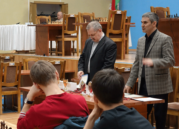 - Знаете, хорошо, когда не тренер говорит о своих учениках, а ученики о тренере. Но если так поставлен вопрос, то хотел бы, прежде всего, назвать мг Сергея Азарова, мм Ирину Тетенькину. Кстати, в 2001 году они оба стали чемпионами Беларуси среди мужчин и женщин, соответственно. Не возьмусь сказать, что это единственный случай в нашей стране, но, что крайне редкий — точно. Далее мг Владислав Ковалев, мм Виталий Мерибанов, мс Мария Невеселая, Александр Кочеев, который никак не соберется оформить себе звание международного мастера, км Алексей Терзи и Андрей Минальд (не обижайтесь, если кого забыл). С прошлого года у меня занимаются кмc Мария Колядич, Анна Сташис и Михаил Никитенко. Надеюсь, за это время я не успел их «испортить». Маша стала 3-ей в чемпионате Беларуси среди женщин, что дает возможность присвоения звания мастера спорта, Аня заняла 2-е место в первенстве Беларуси среди девушек до 14 лет, ну, а Миша не только стал победителем в своей категории, но и здорово сыграл в чемпионате Беларуси среди мужчин и в турнире памяти Д. И. Бронштейна, где выполнил балл международного мастера. Из тех, кто уже оставил серьезные шахматы, но в свое время становились победителями и призерами первенств Беларуси в своих возрастных категориях, а кто-то даже входил в Олимпийскую сборную, хотелось бы отметить сестер Хомяковых, Глызина, Буланова, Ремнева, Погосяна, Смолича, Зеленко, Сурина, Шеремета (и тут простите, если кого не вспомнил). Хочу поблагодарить всех тренеров, которые передавали мне своих воспитанников на разной стадии их шахматного пути.