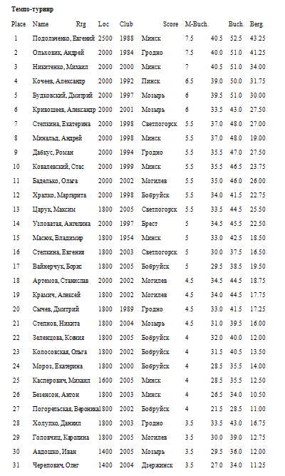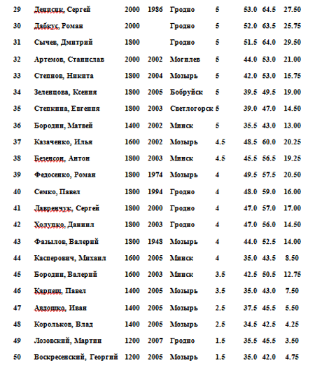 23 Бутелевич, Евгений 1400 2004 Гродно 3.5 29.5 36.0 8.00
