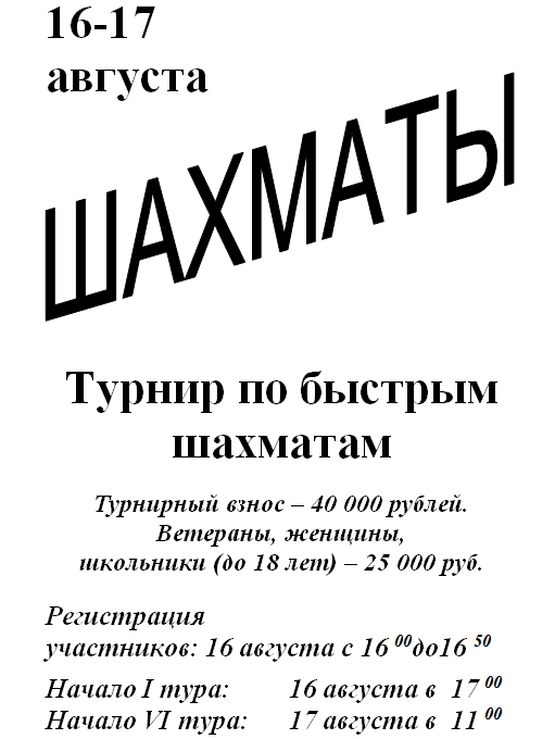 16-17 августа в столичном РЦОПе (ул. К.Маркса, 10) пройдет турнир по быстрым шахматам.