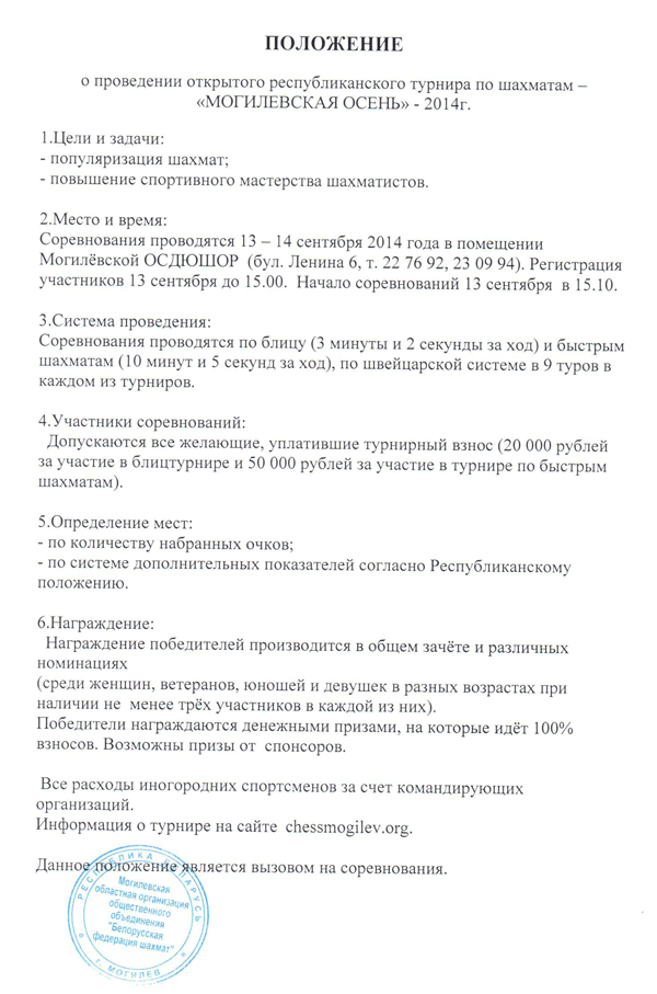 13-14 сентября в помещении Могилевской ОСДЮШОР пройдет открытый республиканский турнир по шахматам "Могилевская осень — 2014".