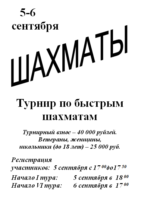 5-6 сентября в столичном РЦОПе пройдет турнир по быстрым шахматам.
