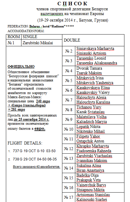 Общественное объединение “Белорусская федерация шахмат” и национальная авиакомпания “Белавиа” определились об окончательной стоимости авиабилетов по маршруту Минск-Батуми-Минск.